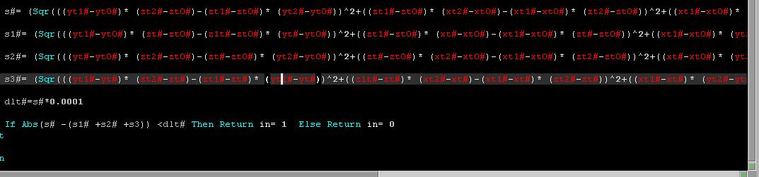 s2#= (Sqr(((yt#-yt0#)* (zt2#-zt0#)-(zt#-zt0#)* (yt2#-yt0#))^2+((zt#-zt0#)* (xt2#-xt0#)-(xt1#-xt0#)* (zt2#-zt0#))^2+((xt#-xt0#)* (yt2#-yt0#)-(yt#-yt0#)* (xt2#-xt0#))^2))/2