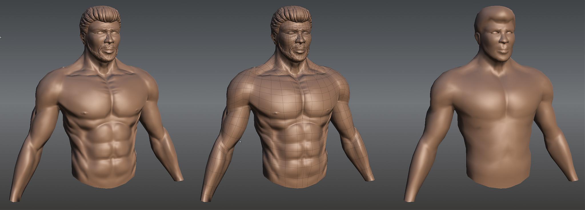 В данный момент в модели 3к, думаю уложиться в 7-8к, с амуницией. На лице сетку сделал поплотнее с учетом использования липсинка. Пока сетка не финальная, и есть анатомические косяки буду править, хоть перс и не главный ГГ и вид от 3-го лица, а на скрине пока торс с сеткой, нормалом и просто меш.