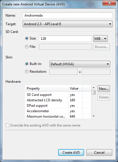 Итак, после того как все необходимые версии будут скачаны и установлены нам нужно будет зайти в раздел "Virtual Devices" (см. рисунок 9) и создать там хотя бы одно виртуальное устройство, которое мы будем использовать в качестве эмулятора телефона для проверки работоспособности наших программ. Для этого нажимаем кнопку "New...". Далее придумываем имя (Name) нашего устройства, можете писать любое. В поле Target -указываем какую версию ОС Android вы бы хотели видеть на вашем устройстве. Пока ставим максимальную - 2.3 (хотя реально выпускаемые телефоны по большей части поддерживают версию 1.6) Указываем количество памяти на SD карте в мегабайтах, в поле Skin указываем желаемый размер дисплея у устройства. Можете выбрать данный размер из таблички представленной ниже. В поле Hardware можете несколько раз понажимать кнопку "New" и добавить в эмулятор дополнительные функции как то акселерометр, GPS, поддержку камеры и записи звука и проч. Как только введем все параметры, можно нажимать на кнопку "Create AVD" (см. рисунок 10).