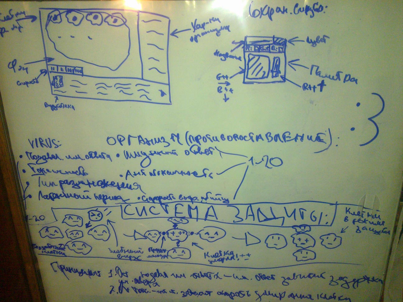 Сейчас занимаюсь составлением списка характеристик, изучением статей и рефератов про вирусы и составлением принципов взаимодействия. Затем буду придумывать сам геймплей.