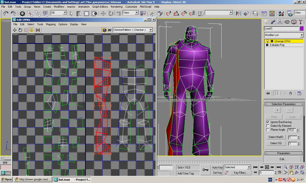 С развёрткой ты чтото мудришь  Например ногу можно развернуть цилиндром одним махом (шов будет с внутренней стороны ноги). Голову тоже цилиндром(шов на затылке и макушке). Такой персонаж разворачивается минут за 20.