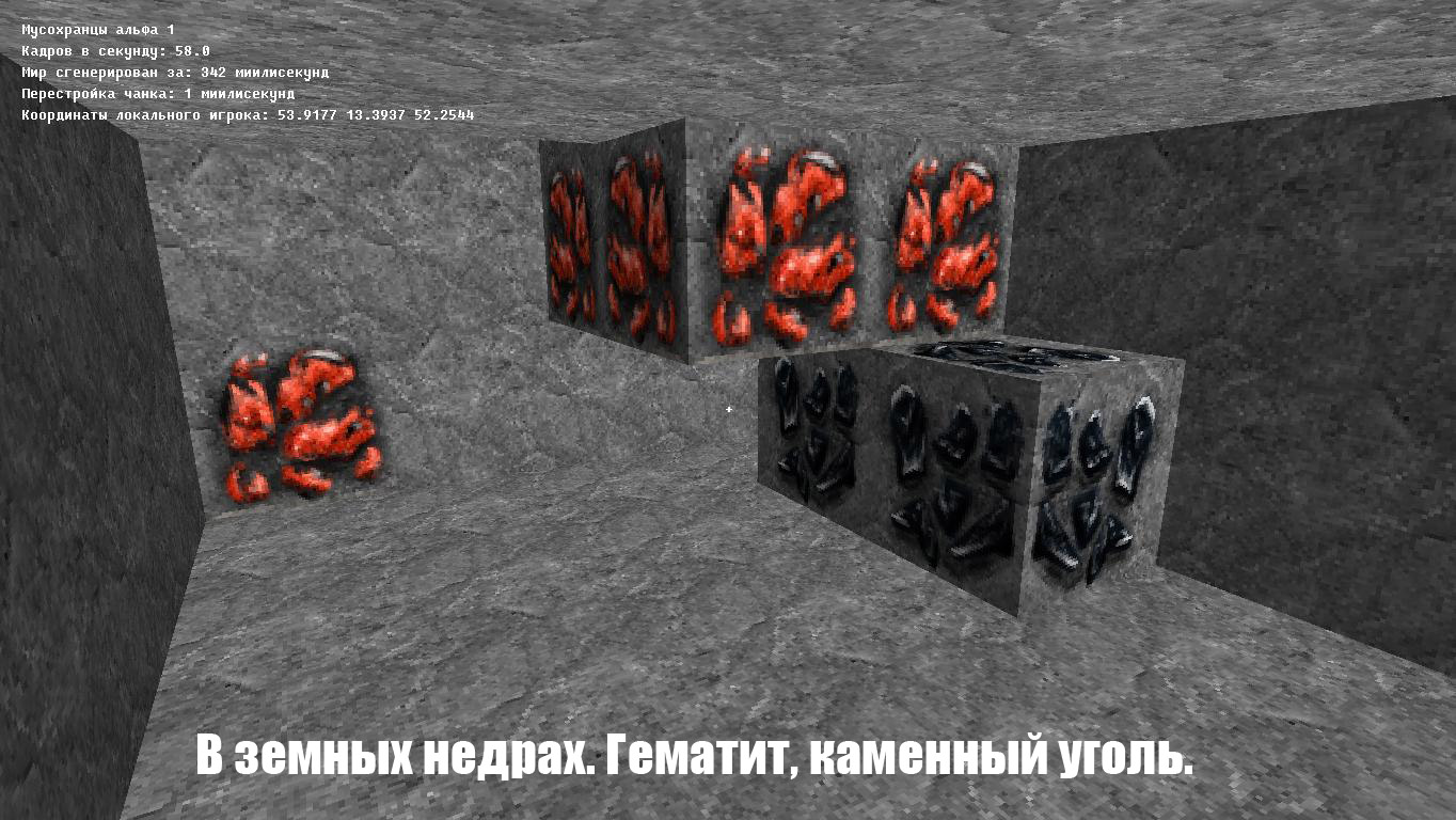 красная руда похожа на куски крабов или какую-то другую расчлененку (и зачем от них дешевые тени будто они висят над текстурой камня?), а чёрная чем-то смахивает на трёхглазый смайл (композиция кусков руды не лучшая). цвет тумана тоже неподходящий.