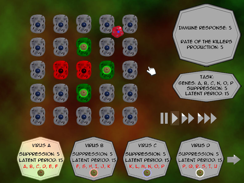 Хар-ки "иммунный ответ" организма и "подавление иммунного ответа" вируса влияют на то, сколько клеток сможет заразить игрок, прежде чем они перейдут в режим защиты. Каждый раунд начинается с паузы, и, если игрок снимет её и хотя бы одна клетка заражена, клетки перейдут в режим защиты независимо от этих двух параметров.