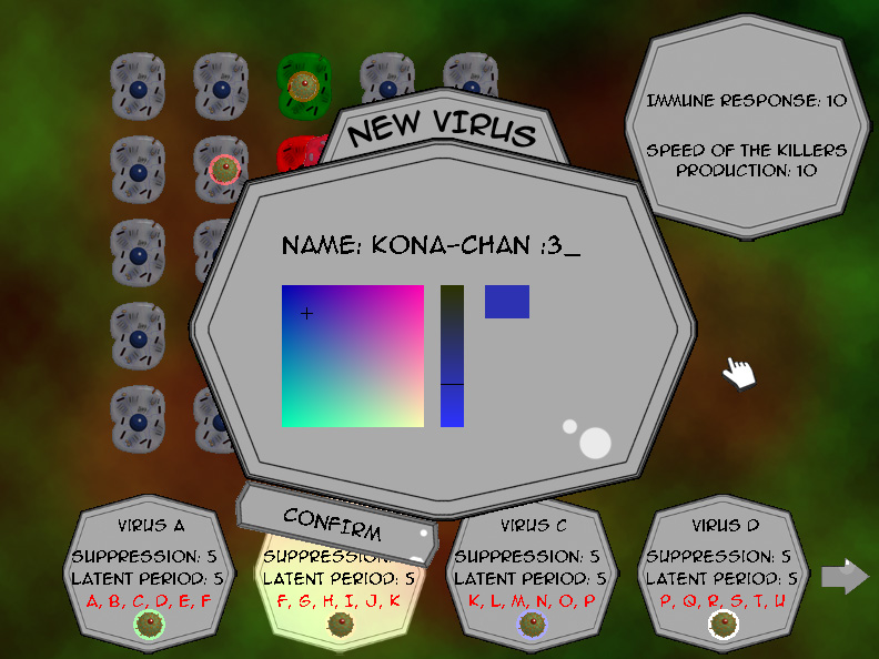 Вирусы живут только в клетках. Изначально игроку даны 5 вирусов с набором генов от "A" до "Z". У каждого вируса есть 2 характеристики - "подавление иммунного ответа" и "латентный период".