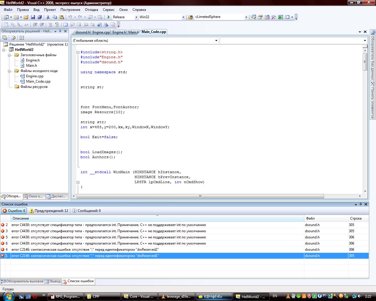 Хочу воспроизвести звук написал программу на DirectSound, но ругается на поключаемый заголовочный файл dsound.h, мол в нем ошибка. В другой программе, которая работает подключил его же и выдает ошибки в файле dsound.h, причем ругается только на одну структуру. Кто знает в чем проблема?