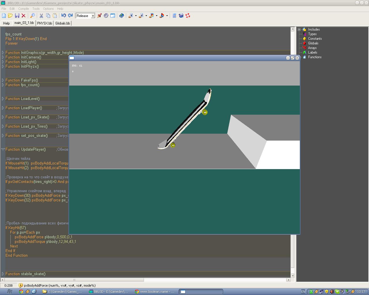 вобщем выкладываю то что пока есть , т.е. основная механика почти готова, менять буду уже по мелочам, например сделаю более удобное катание на двух колесах(менуал) и т.д.