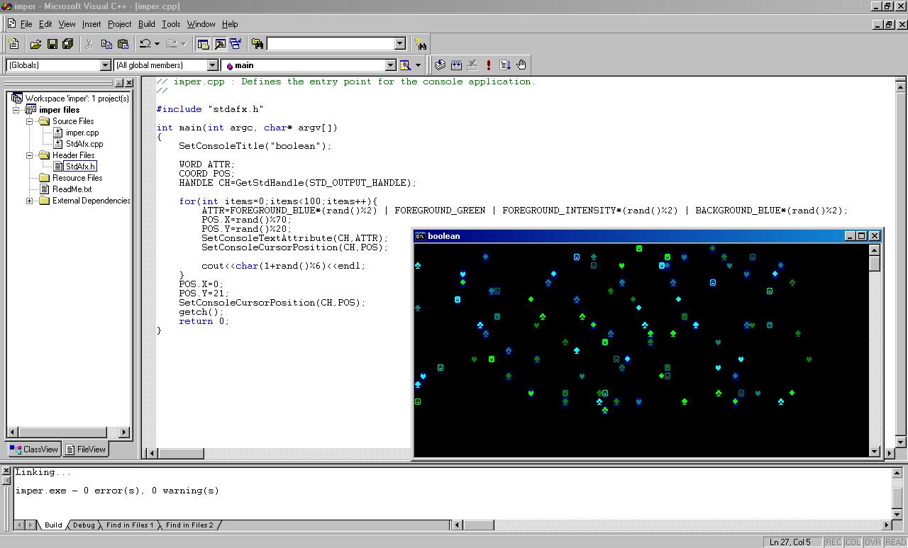 Код может потребовать доработки под конкретную конфигурацию. Картинка может отличаться от приведённой, т.к. параметры используемого в качестве ГПСЧ ЛКГ у разных компиляторов разные.