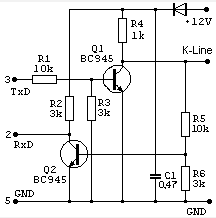 ViNT, эта микросхема, простой адаптер-преобразователь, для сопряжения ПК или МК. K_Linia 12 вольтовая, для наглядности вложил простую схему такого адаптера на транзисторах. В МК есть прерывания как на передачу так и на прием, програмно можно игнорировать эхо. Но мне пришла мысль, незнаю, может получится так, сильно завалило снегом, не могу пока добраться до машины чтоб поэкспериментировать