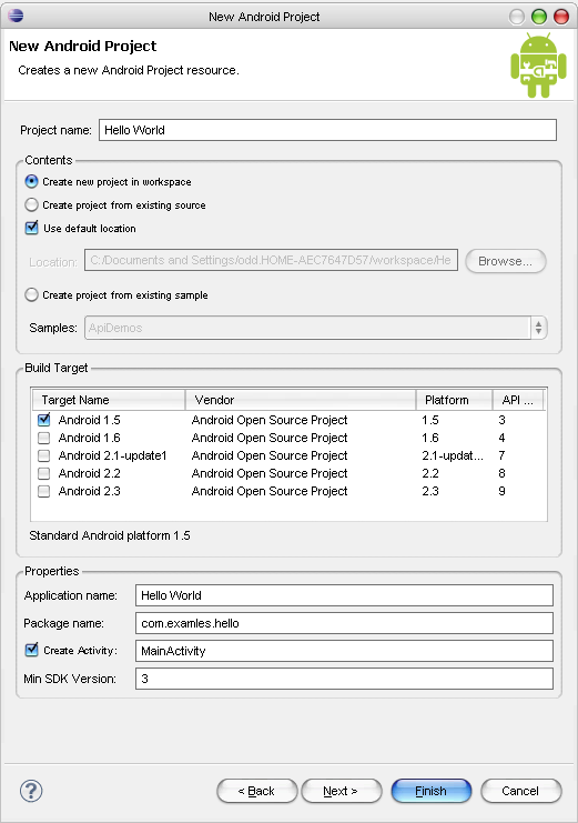 Build target выбираем версию ОС под которую будет рассчитано наше приложение: выбираем версию 1.5. Если список версий не отображается, значит вы не указали или неправильно указали в настройках расположение Android SDK. Подробнее читайте в FAQ по настройке и установке Eclipse IDE.