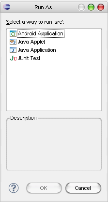 Итак, краткий обзор папок приложения я провел. А как же его запустить в эмуляторе? Для этого жмем клавиши Ctrl+F11 или через меню Run - Run в итоге у нас появится окошко с вопросом как запускать это приложение (см. рисунок 4). В данном окне нужно выбрать строчку "Android Aplication". Ура! Начался запуск эмулятора телефона. Эмулятор запустился и сразу порадовал нас заблокированным экраном (см. рисунок 5). Не очень дружелюбно с его стороны. Сначала нам нужно снять телефон с блокировки. Для этого нужно мышью нажать на картинку замочка и переместить замочек вправо. Появится рабочий стол мобильного телефона (см. рисунок 6). Снова нашей программы не видать. Где же она? Нажимаем мышью на кучу квадратиков в нижнем углу экрана. Появится главное меню мобильника (см. рисунок 7). Ну наконец-то, можно увидеть иконку нашего приложения Hello World. Теперь для запуска приложения кликаем по его иконке и лицезреем на экране работу нашего первого приложения под Android (см. рисунок 8).