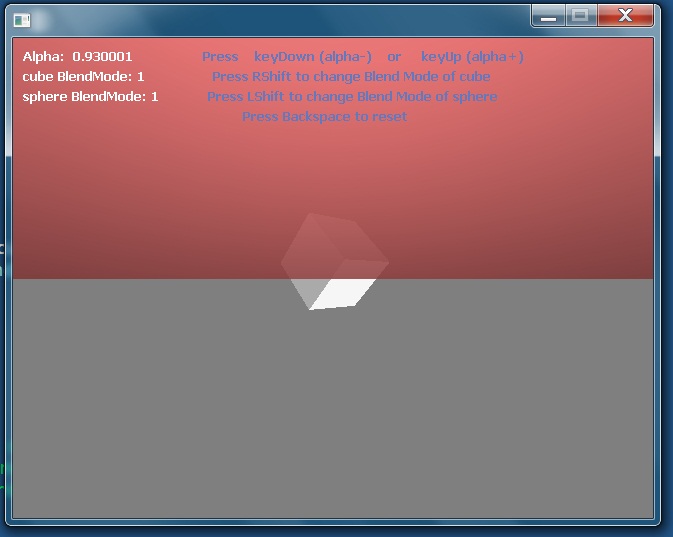 Значение альфа меняется стрелками вверх и вниз. Альфа канал меняется одновременно у куба и у сферы.