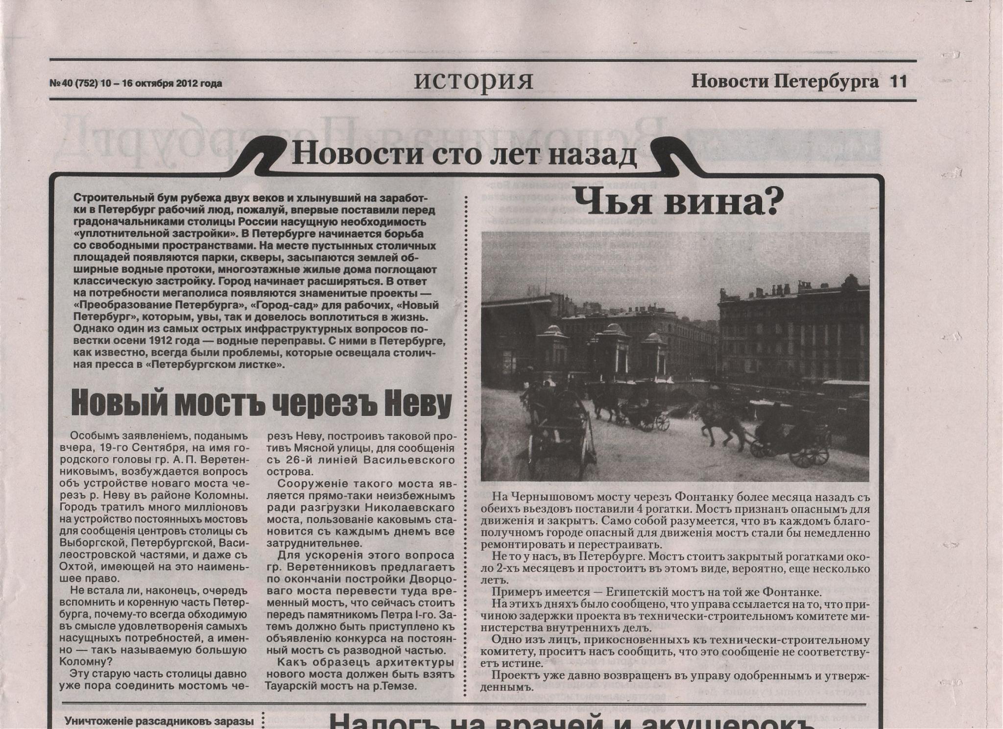 В магазине «Дом книги» взял бесплатную газету "Новости Петербурга", в которой приведён фрагмент газеты Петербургский листок (100-летней давности).