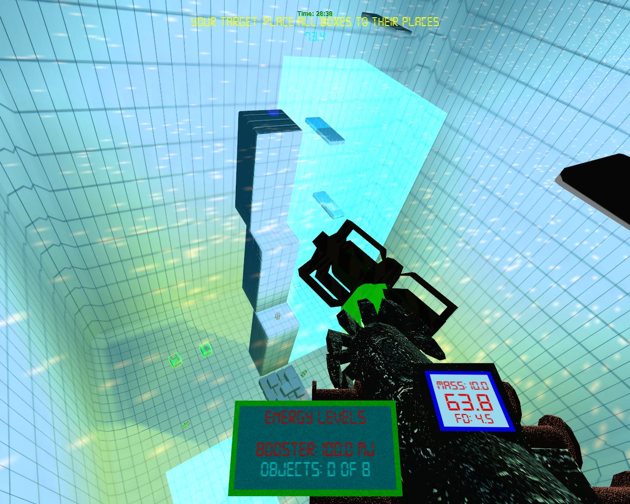 Управление: WSAD - передвижение. Пробел - включить бустер. Колёсико мышки - изменить фокусное расстояние магнитной пушки. Правая кнопка мышки - подтянуть объект и, если достаточно близко, взять. Левая кнопка мышки - бросить взятый объект. E - положить объект.