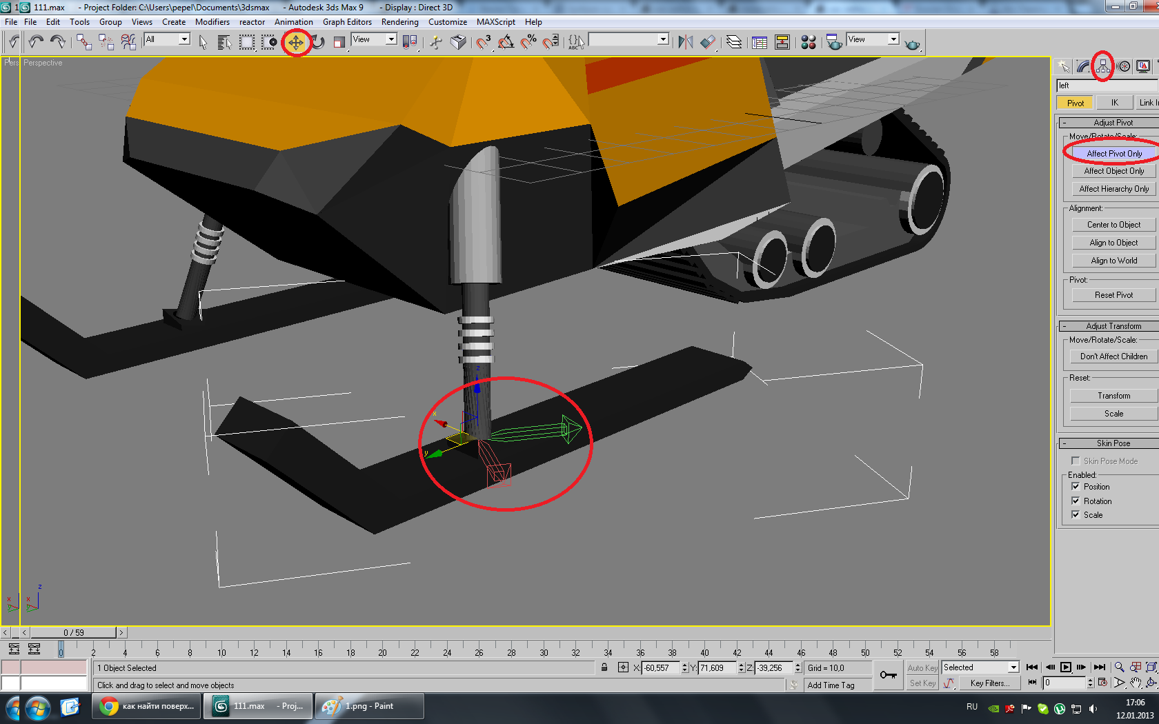 загрузил модель снегохода(анимация поворота лыж сделана в 3д мах),т.е анимацию где у него лыжи поворачиваются (с целью анимировать и использовать в игре).