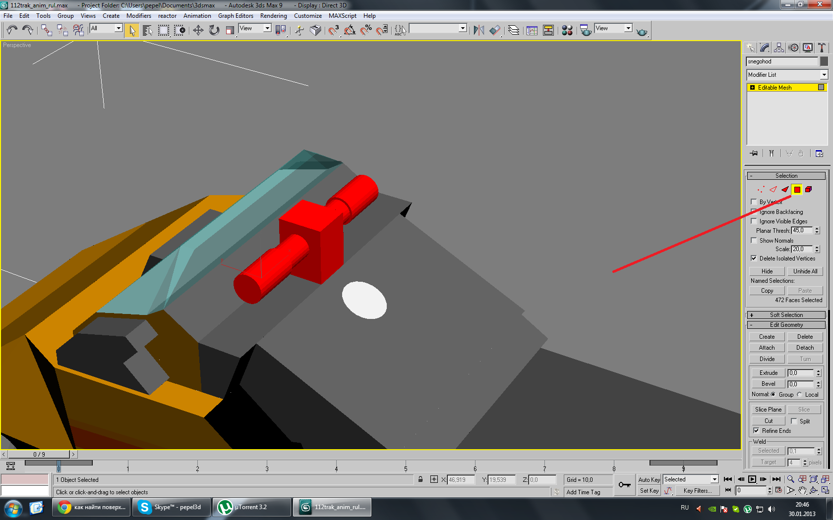 1) и теперь я пытаюсь отдетачить руль у снегохода чтобы его тоже крутить в б3д. но тут непонятно: вместе с рулём почему-то отдетачивается часть поверхности, хотя выделял по вершинам правильно и повторил это 2раза.