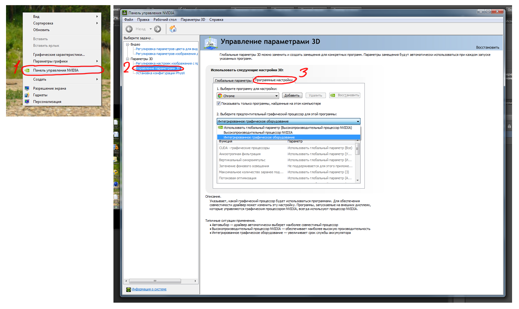 По менюшкам вроде так: есть глобальная настройке в панели управления Nvidia, которая с дровами ставится. Также, если я не ошибаюсь там можно выставить отдельно для любого .exe файла. И еще должен появляться такой пункт в контекстном меню у исполняемых файлов.
