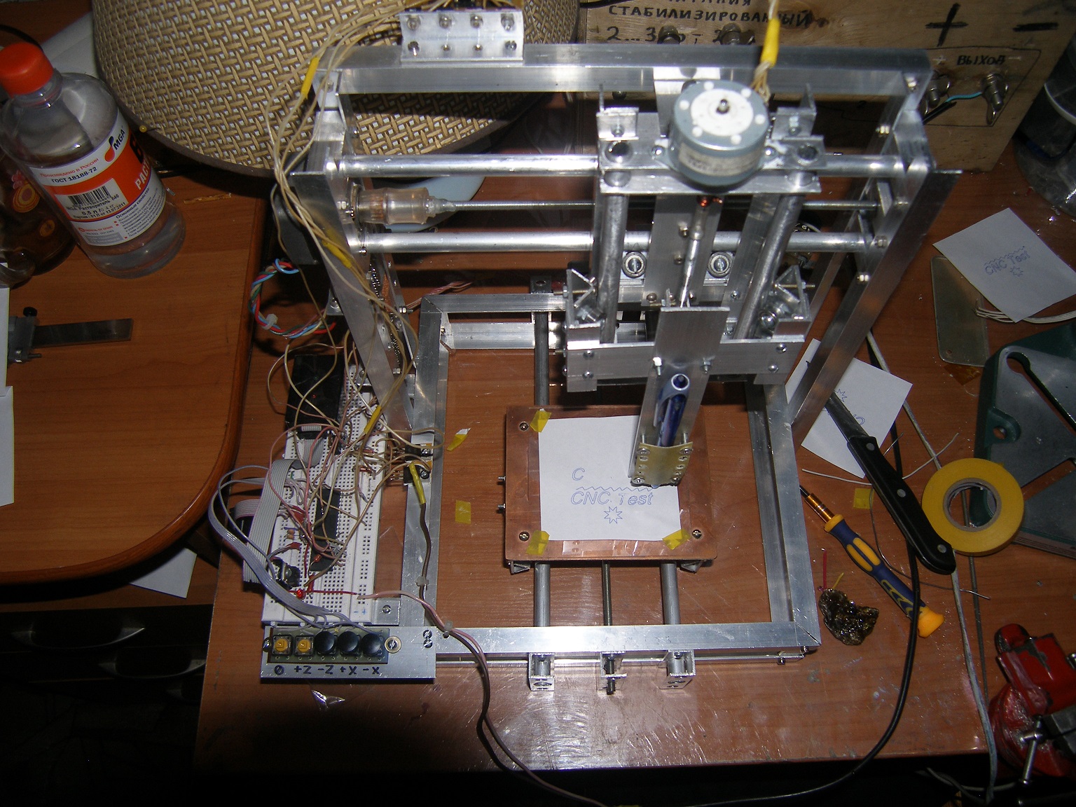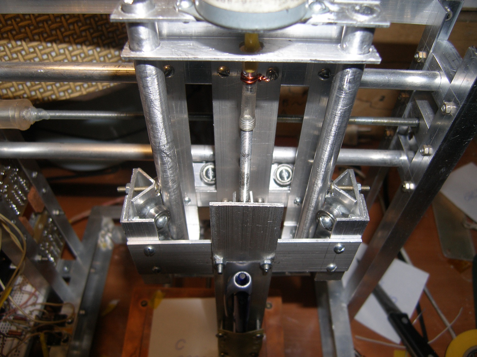 С механикой та же фигня. Ну не тянет меня тратить килобаксы на детали. Купил в строительном магазине алюминиевого профиля всякого разно и погнал. Никаких CAD не использовал - всё на глаз. Несмотря на это, конструкция получилась очень жесткая( на видео заметно что ручка "прыгает" по бумаге, но это чисто зазор между стержнем и корпусом ручки влияет ). Единственное, с чем лопухнулся, так это с направляющими - надо было ставить квадратную трубу, а не круглую - из-за этого есть продольный ход оси Y ). Механику делал дома при помощи: дрели( на стойке ), кучи сверел, зенковки, ножовки по металлу. Двигатели из принтеров. Кароч бюджетный вариант - любой сможет повторить - отпугнуть может лишь дохерища отверстий и куча винтов.
