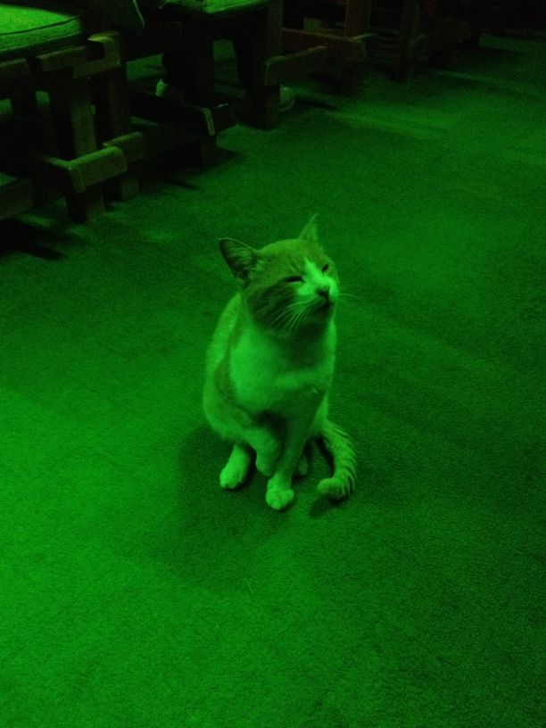 Кот-попрошайка в кафе. Работает в паре с таким же умильным щеночком. Даже лапу поджал.
