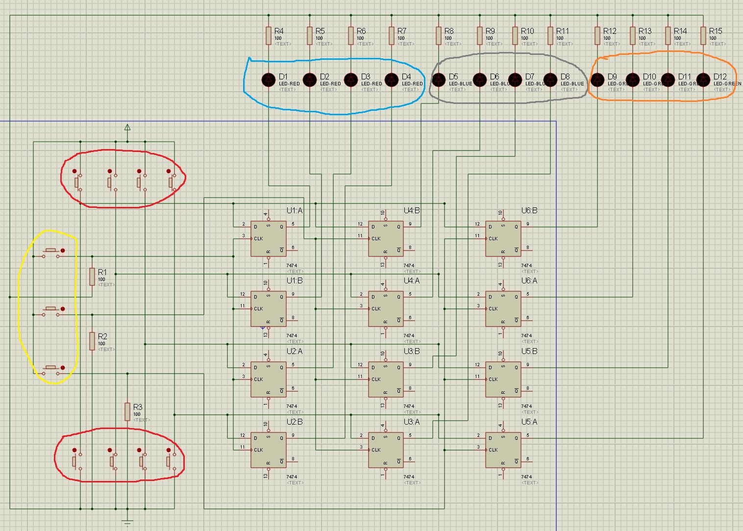 Красным обведены переключатели задающие двоичный код поступающий на каждые четыре триггера отвечающие за каждый "двигатель"( для наглядности поставлены светодиоды". Желтым обведены переключатели задающие то на какой двигатель пойдет двоичный код. У нас двоичный код - это просто указание того какую из четырех обмоток шагового двигателя включить в данный момент.