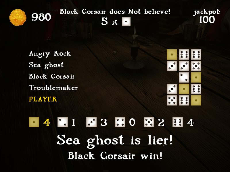 Не умею играть в кости. Игра забавная но слишком быстро мелькает текст на экране, не успевал читать, расстановки нет. Было-бы интереснее если человечки конечностями шевелили и ром из бутылок прихлебывали =) тысяча чертей йохохо!