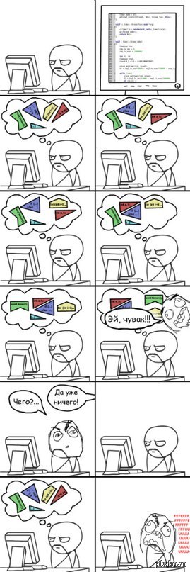 Сижу над жутко сложной системой и ищу там хитрый баг, который уже полчаса ускользает от меня, но почти взят за шкирку. Стучит в дверь мама, стучит и стучит, стучит и стучит, стучит и стучит. Да чёрт возьми, наверное, что-то случилось! Сдираю с себя наушники, подхожу к двери. "Картошку буууудешь???" Всё. Вся система, за последние полчаса кропотливо собранная в мозгу, разрушилась. Зато мозг задумался о картошке. Диверсия! Поезд пошёл под откос! Эстакада моста полетела в воду! Блин, боюсь выйти из комнаты до толчка днём во время интенсивной работы, чтобы не отвлекли каким-нибудь "Там суууупчик в холодильнике!!".
