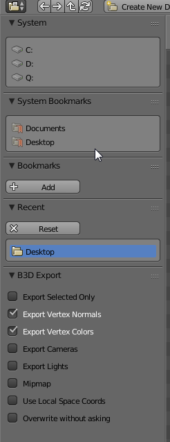 Недавно решил протестировать blender. Порывшись в интернете нашел скрипт для экспорта в b3d. Но вопрос, если модель имеет текстуру и анимацию. Как быть в данном случае, если в аддоне по экспорту всего (на сколько я понял) 2 галочки. Либо же можно запустить анимацию кодом из Blitz3d? Скриншот экспорта в b3d из blender прилагается. А также скрипт экспорта из блендер (его нужно поместить в папку C:\Program Files\Blender Foundation\Blender\2.72\scripts\addons), потом нажать на file-user preference-Addons (выбрать Import-Export в левой части) и поставить галочку над экспортом b3d)