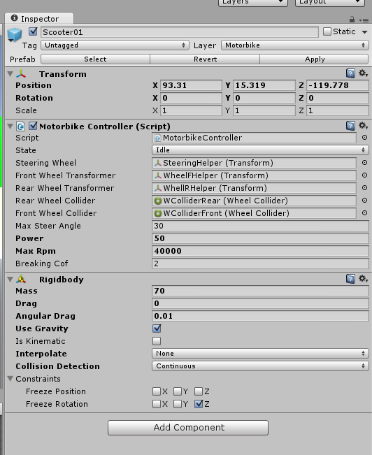 1. Если вы настраивали WheelCollider_ы и обнаружили что после ваш мотоцикл трясет, или же он скачет как лошадь - скиньте параметры WheelCollider_ов к стандартным.