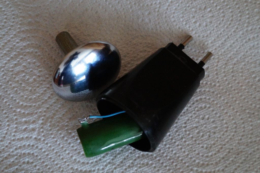 Внутри зеленая радиодеталь в виде трубки, довольно тяжелая, по бокам с разных концов от нее уходят контакты в розетку. Надо отметить, что заглушка полностью металлическая и похоже в этом скрыт какой-то смысл если учитывать что шпилька от заглушки вдевается внутрь трубчатой радиодетали.