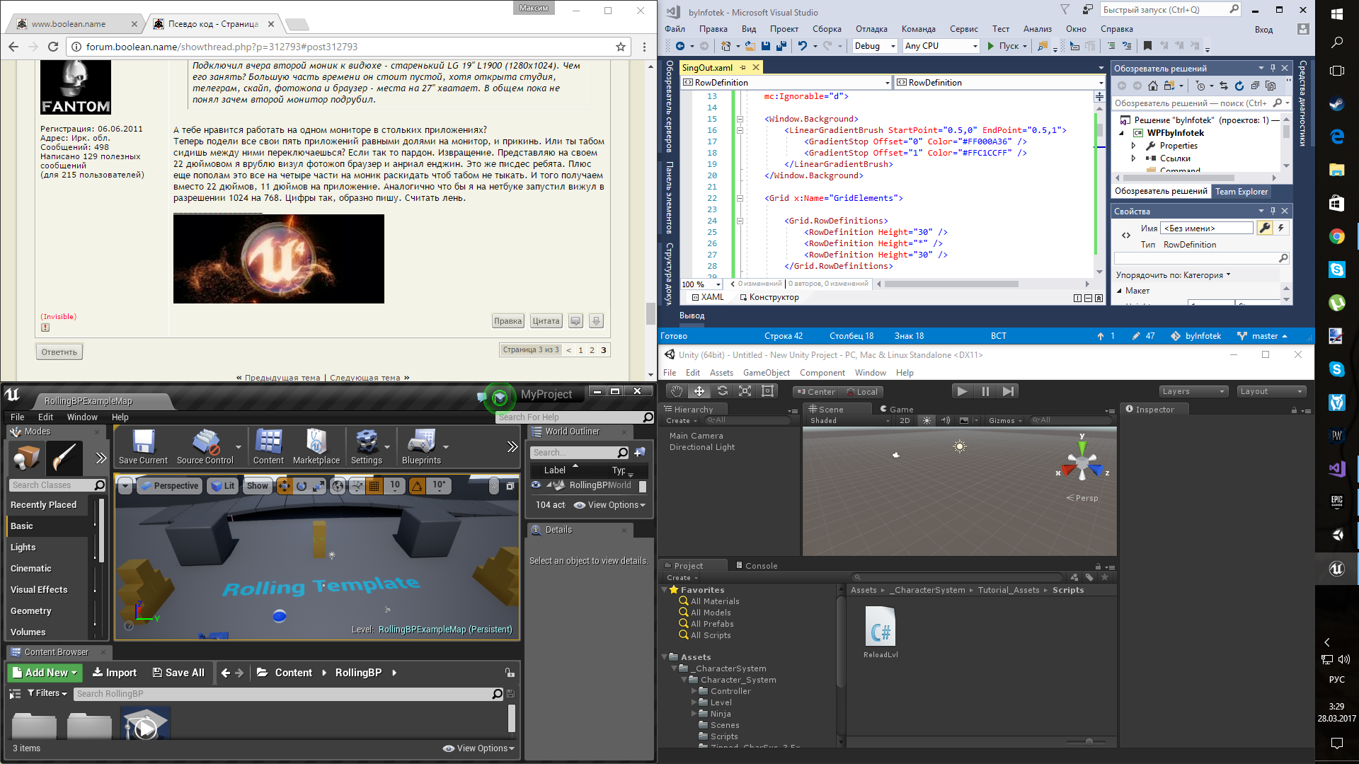 Раскрою секрет: 2 монитора это вообще всегда хорошо. Всегда у тебя открыто больше одного окна. Это значит, надо альт-табаться, хоть ты и в Блице кодишь. Меньше альттабов — лучше производительность оператора ЭВМ. При работе с Юнити вообще мастхев: на одном монике сцена, на соседнем — код. Пожалуй, единственный случай, когда 2 моника не очень надо — просмотр фильмов и игра игор.