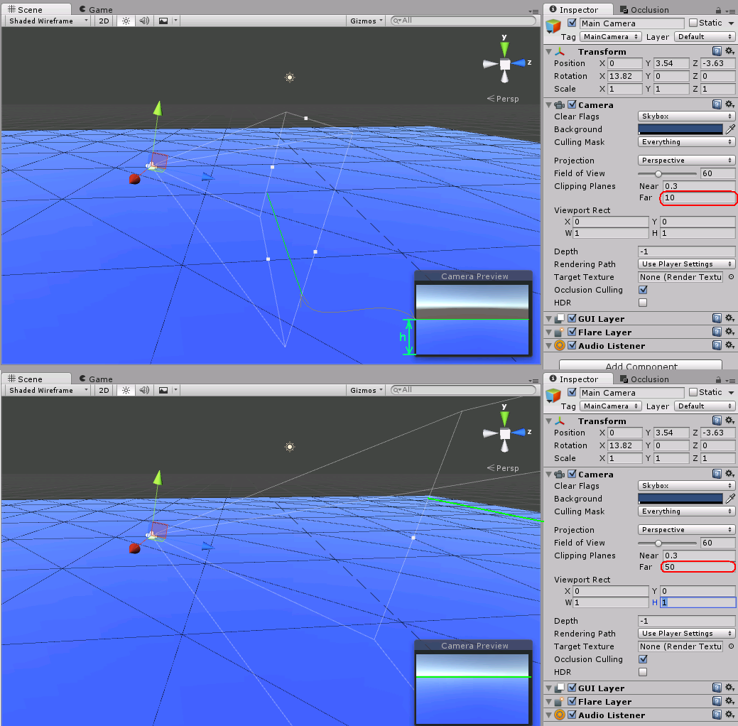 В общем если смотреть скриншот нужно рассчитать высоту зеленой линии на экране. Она получается ниже реальной линии горизонта потому что Far clip plane камеры обрезает синюю плоскость ближе.