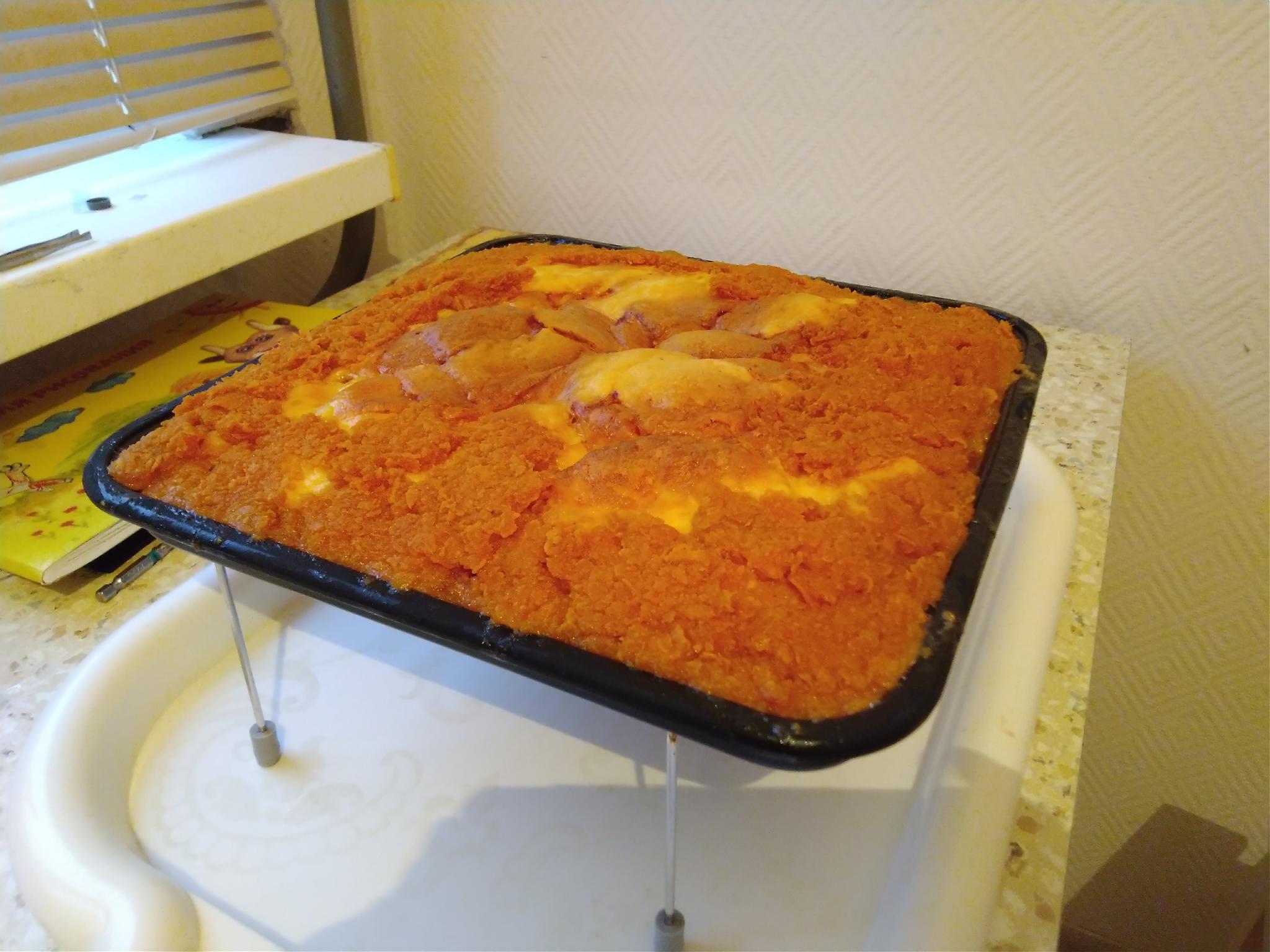 Экспериментально дополнил шарлотку персиками и черешней: