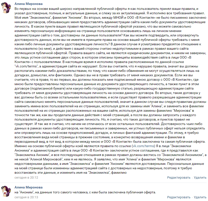 в "Алину Миронову" (а другого аккаунта в VK у меня и нет).