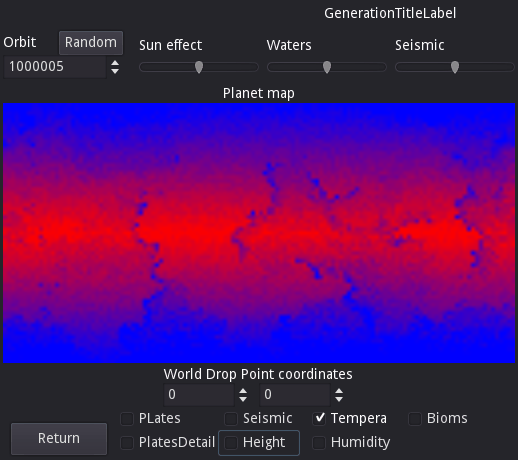 Исходными данными для построения планеты являются следующие данные: Номер орбиты (Seed), Тепло от солнца (SunEffectKoef [0-10]), количество жидкости (WatersKoef [0-10]), сейсмическая активность (SeismicKoef[0-10]). Для ускорения расчетов карта планеты имеет размер 128х64.