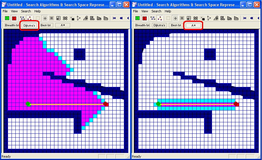 Отличие алгоритма А* от Дикстры в том, что волновой поиск "включается" только при столкновении с препятствием, а до этого он работает как обычный алгоритм приближения.