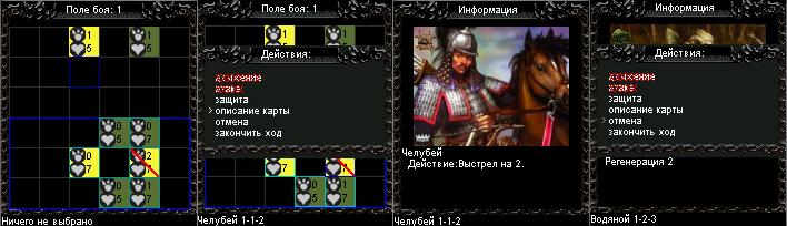 Можно проделать атаку или действие или выстрел выбрав пункт атака "атака", курсор станет красным для выбора цели, во время атаки можно переключать атаки|действия кнопкой 7, атака происходит пока только с самой слабой силой без всяких бросков кубика (ибо пока всеравно не введенеа защита! потом все зделаю). Если карта атаковала - она закрывается до следущего хода игрока -перечеркивается красной чертой; если карта отравлена она перечеркивается зеленой мигающей чертой (ну не помещаются на картах все значки при минимальном расширении экрана).