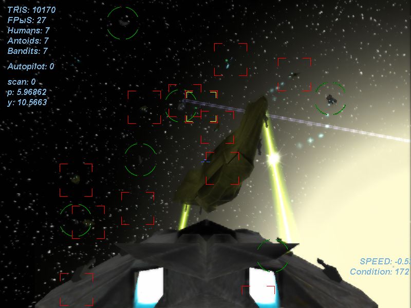 Вы - человек, которому суждено выбрать к какой из трех сил присоединиться. У всех трех сторон набор кораблей, адаптированных под человека и как правило сделанных человеком, одинаков. При смене сторону меняется лишь текстура-раскраска (возможно помимо простого боя будет прохождение уровней с зарабатыванием денег/улучшениями-оружия, щитов). В уровнях будут различные условия усложняющие уничтожение врага, возможно будут уровни на "вынос" крейсера или базы. Из-за перехода игры в разряд аркадных радар делать не буду.