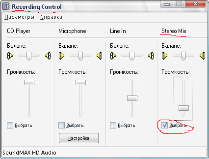 В настройках звука в винде выбираем устройство записи - StereoMixer (желательно вырубить остальные звуки в винде.)