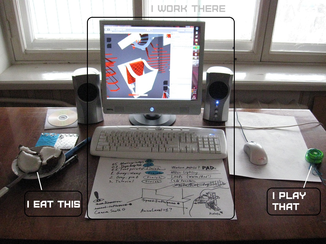 6.Другого места для стола пока нет. С домашними вопрос решен лет 10 назад, никто никуда не подсматривает. Единственное ребенку пока не обьяснишь,что если папа встал чтобы пойти на кухню что нибудь сгрызть, не обязательно сразу же залазить на стул и жмакать на все ,что только жмакается(1 год и 8 месяцев все таки. Но то что это папин бук и наступать на него когда он лежит на полу не стоит, уже запомнил)