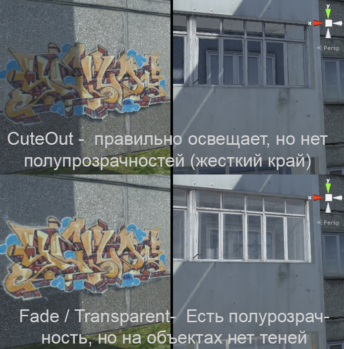 Снова вопрос по материалам. Никак не могу добиться полупрозрачного объекта , на который ложится тень. В режиме CuteOut все освещено правильно, но полупрозрачности ясное дело нет (или все, или ничего). А в режимах Fade/ Transparent тень не попадает, и объект явно выделяется из окружения. unity5 все настройки стандартные.