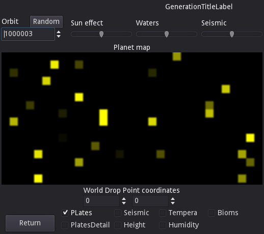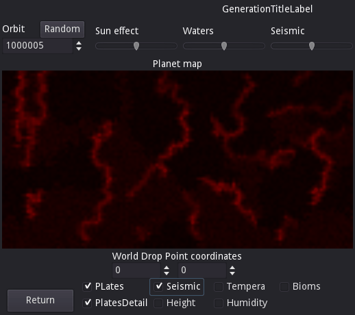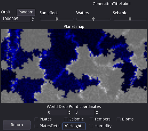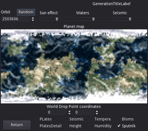 Исходными данными для построения планеты являются следующие данные: Номер орбиты (Seed), Тепло от солнца (SunEffectKoef [0-10]), количество жидкости (WatersKoef [0-10]), сейсмическая активность (SeismicKoef[0-10]). Для ускорения расчетов карта планеты имеет размер 128х64.