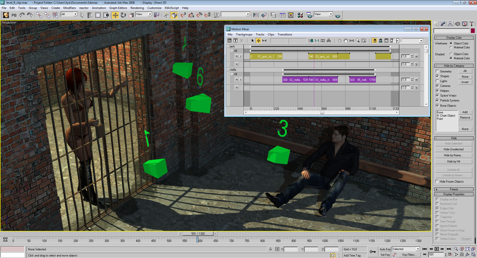 Вот мутил сёдня очередную сцену. Типа на шкале моушн миксера расставляются заранее заготовленные анимации персонажей, анимируются камеры. К камерам привязываются пивоты(зелёные), которые будут долго экспортироваться в b3d вместе со всеми персонажами и анимациями. На выходе получается один большой прибольшой b3d файл. При загрузке его в блице к пивотам привязываются блицевские камеры, реализовано переключение между камерами в определённых монтажных кадрах. Получаем сценку "на движке". b3d - чудесный формат. Съедает всё,