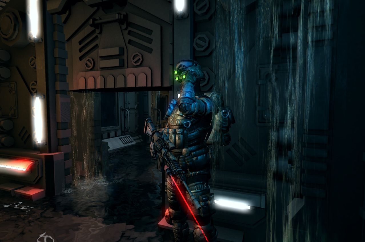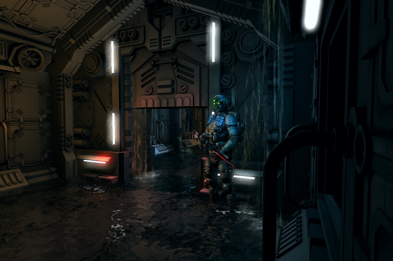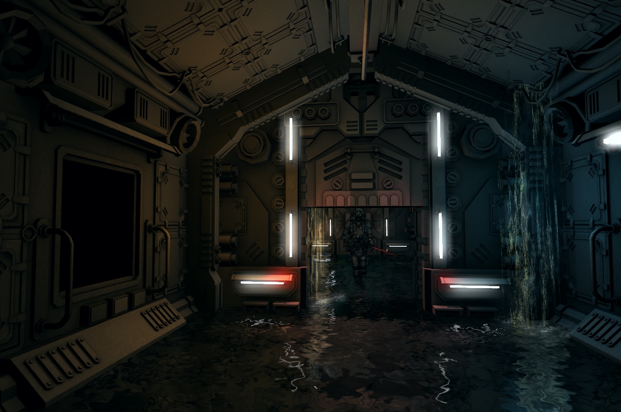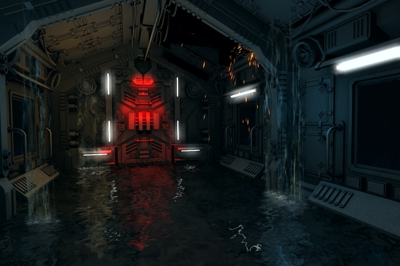 Как это будет играться, вы оказываетесь допустим в коридоре, уровень воды поднимается вы должны открыть дверь (которая аварийно закрыта, горит красным цветом),ага похоже поврежден кабель (который искрит) но вода уже по шею, пара мгновений и вас убило током  , поновой, ага оказываеться можно было включить откачку воды в консоли глав. коридора, воду не откачает но поможет выйграть время пока вы залезете на ящик и обесточите проводку .... соедините и т.д