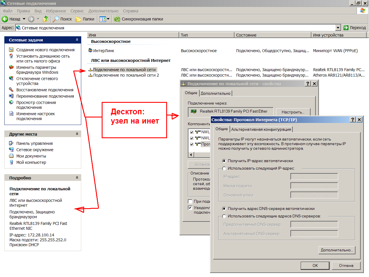 Настройки на десктопе - провайдера, узел на провайдера, узел на локалку...