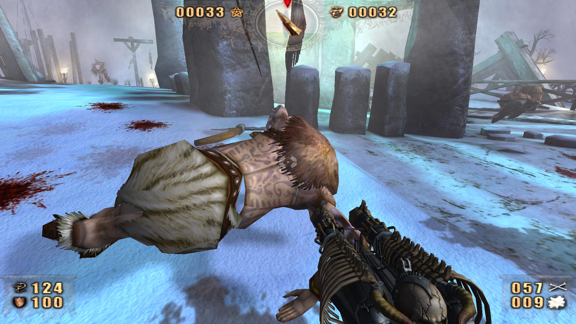 Дробовик теперь полностью перерисован и якобы стреляет костями (“патроны” для него — это мешочки с косточками, и на этикетке тоже косточки символически нарисованы). На деле это выглядит как обычный выстрел из дробовика. Альтернативный огонь точно так же морозит врагов, и в замороженном виде они разлетаются на части от одного попадания. Но если в оригинале враг покрывался инеем, то теперь он чернеет. На значочке патронов нарисовано какое-то облачко. Я так и не понял, что хотел сказать автор своим произведением! Пускай пойдёт и ещё раз подумает, что он там хотел сказать, и выразит свои мысли понятно! В одном из обзоров читал, что это “иссушение”. Чёрное. С облачком. Шта?