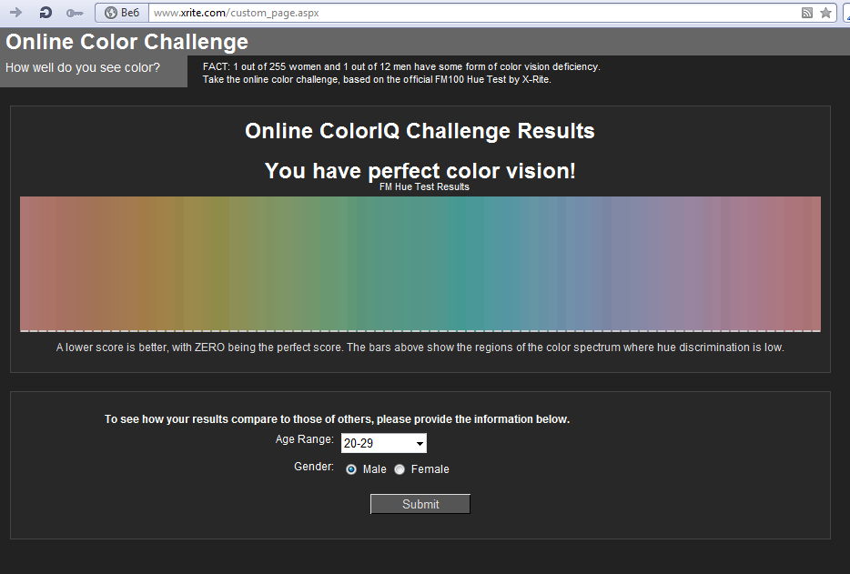 Думаю, для этого теста монитор должен быть нехилый. Для тру-дизайнеров. У меня 12 очков. В тех местах, что ответил неправильно, полоски выглядят одинаковыми. Начинаю смотреть на монитор снизу вверх - отчетливо вижу разницу в тех местах. Смотрю чуть выше, чем обычно - многие полоски сливаются в один цвет.
