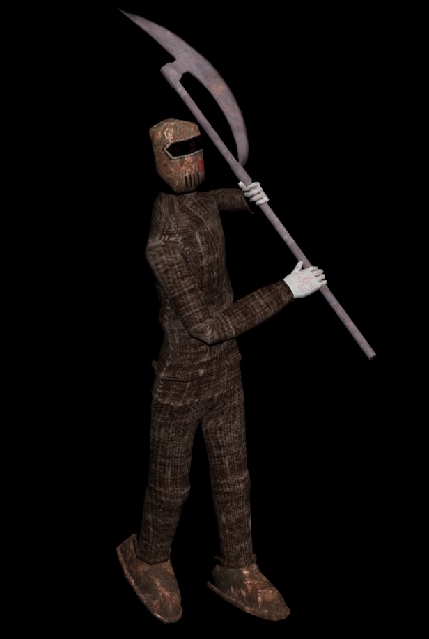Ну как бе этого врага на самом деле то нет, он олицетворение страхов главного героя, который из-за сложившейся ситуации страдает жесткой депрессией с суицидальными наклонностями, просто этот враг помогает ему в этом деле. А бердыш выглядит более брутально, нежели кирка. К тому же враг не шахтер.