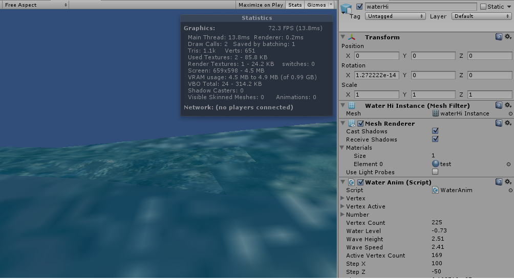 public class WaterAnim : MonoBehaviour { public Vector3[] vertex; public int vertexCount; public float waterLevel, waveHeight; void Start () { vertex = GetComponent<MeshFilter>().sharedMesh.vertices; vertexCount = GetComponent<MeshFilter>().sharedMesh.vertexCount; } void Update () { for (int i=0; i<vertexCount; i++) { vertex[i] = new Vector3(vertex[i].x, vertex[i].y, Mathf.Sin(Time.time)*waveHeight); } GetComponent<MeshFilter>().sharedMesh.vertices = vertex; } }