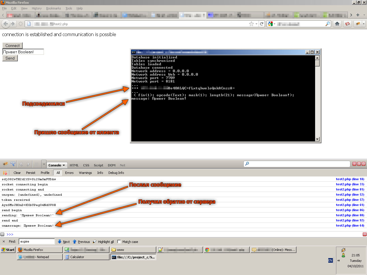 На скрине, простое соединение, и посылка сообщения, сервер при соединении делает handshake, создаёт или привязывает соединение к существующей сессии, далее получает сообщение, и отправляет назад такое же сообщение. В логах консоли видно.