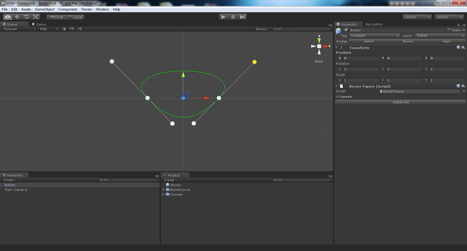 // существует два события, которые можно использовать для отображения // "не визуального" объекта - OnDrawGizmos и OnDrawGizmosSelected // первый выполняется всегда, второй - когда объект выбран // функции рисования находятся в классе Gizmos public void OnDrawGizmosSelected() { // отобразим кривую как 50 сегментов Gizmos.color = Color.green; for (int i = 1; i < 50; i++) { float t = (i - 1f) / 49f; float t1 = i / 49f; Gizmos.DrawLine(Evaluate(t), Evaluate(t1)); } } }
