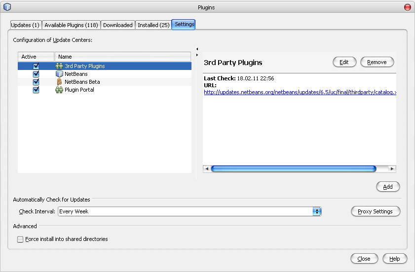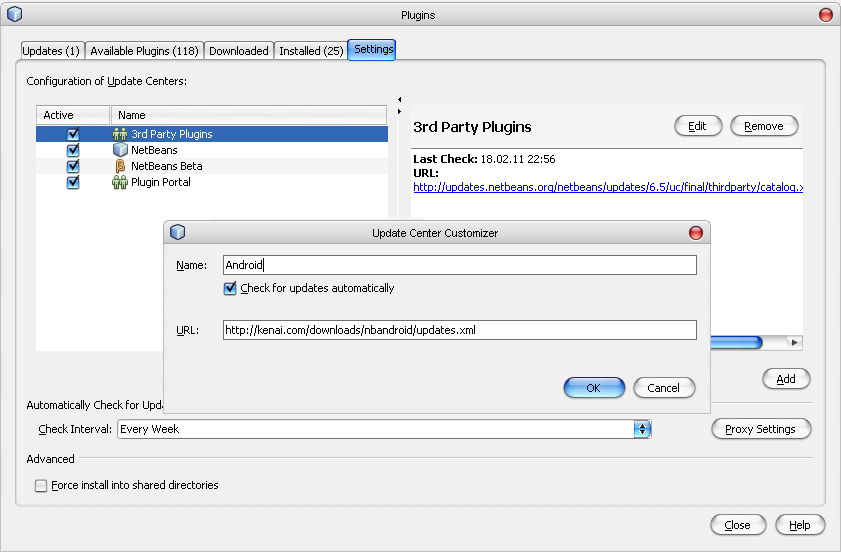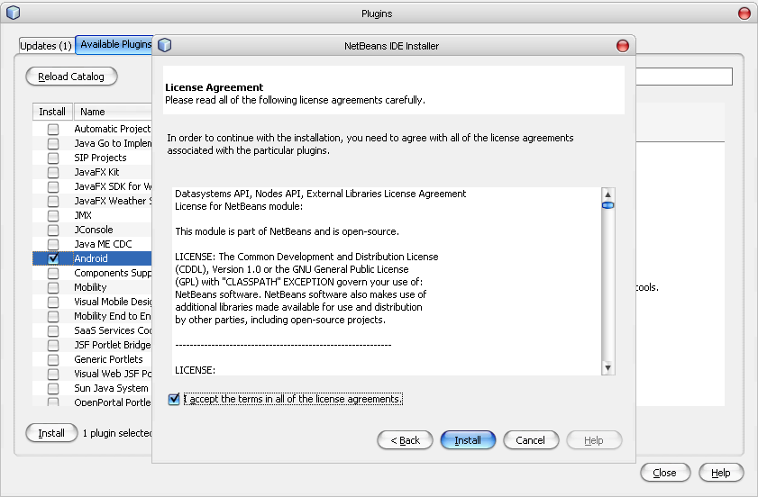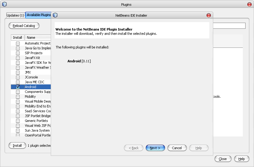 Теперь приступим к настройке среды NetBeans IDE для разработки программ под Android. Для начала запустим среду NetBeans и вызовем пункт меню Tools --> Plugns, перейдем на вкладку Settings (см. рисунок 7). Тут нажимаем кнопку "Add" и в открывшемся окошке вбиваем такие строки (рисунок 8)Теперь нажимаем на кнопку "Ok" и ждем когда среда найдет в Интернете свежий доступный плагин. После чего переходим во вкладку "Available Plugins". В списке доступных плагинов (рисунок 9) находим и помечаем галочкой плагин под названием "Android" (для облегчения поисков ищите категорию Mobility). Нажимаем на кнопку "Install", затем "Next", ставим галочку о том, что мы согласны с лицензионным соглашением и снова жмем "Install" (рисунки 10 - 11). После чего начнется загрузка необходимого плагина, подождем немного. После того как плагин скачается нужно будет перезагрузить среду Netbeans.